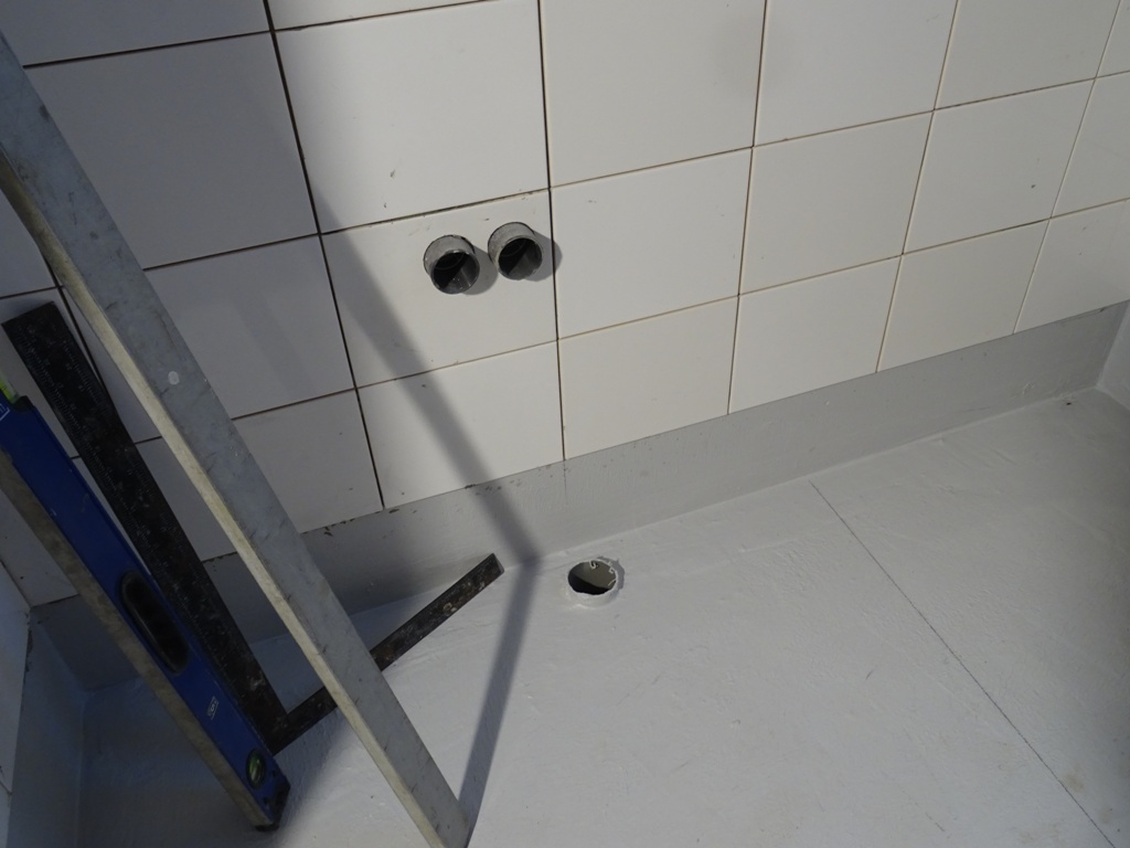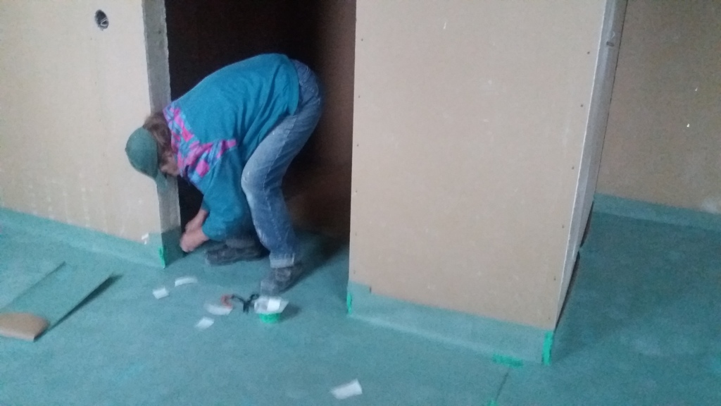 Kylpyhuoneiden kaakelointi edistyy alakerrassa.