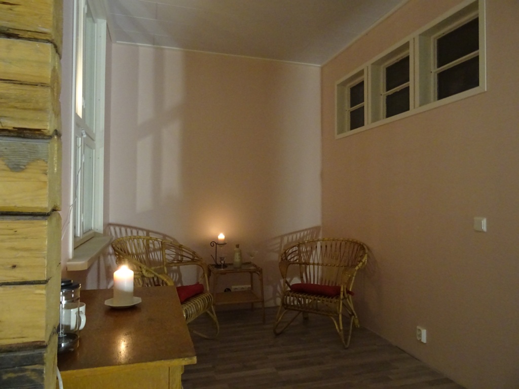 Tsaarinvallanaikainen riihen musta seinä, viime vuosisadan puolenvälin ikkunarivistö sekä uuden uutukainen panelointi.