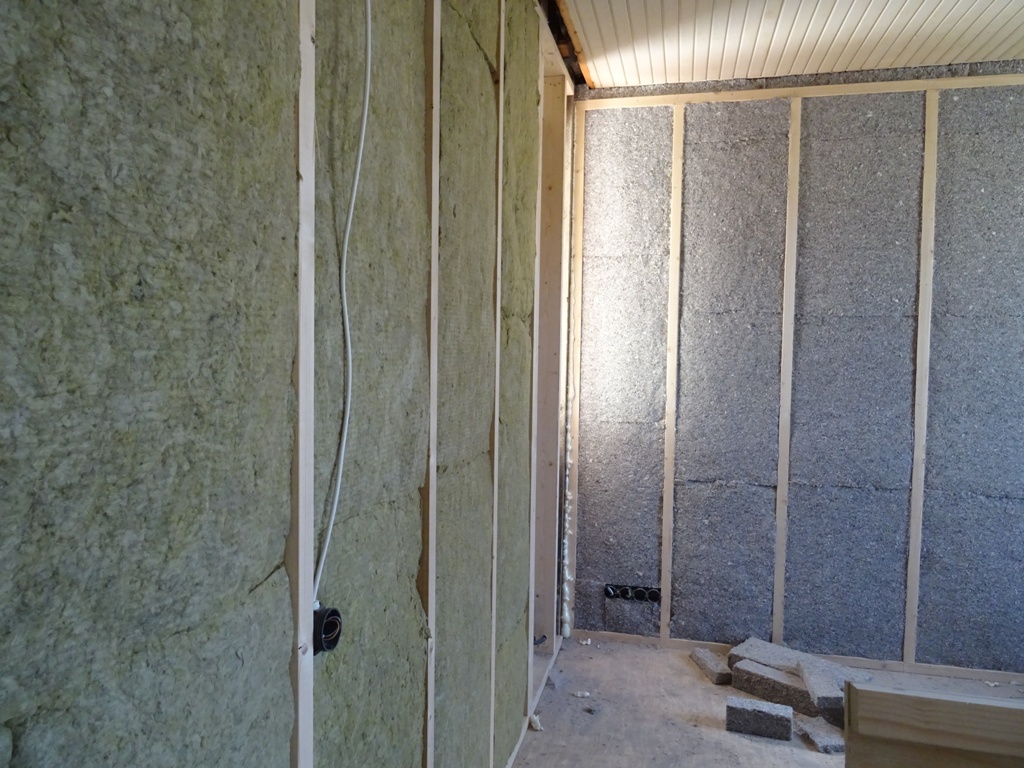 Alakerran ulkoseinien liäseristeen koolausta ja yläkerran rakentamista.