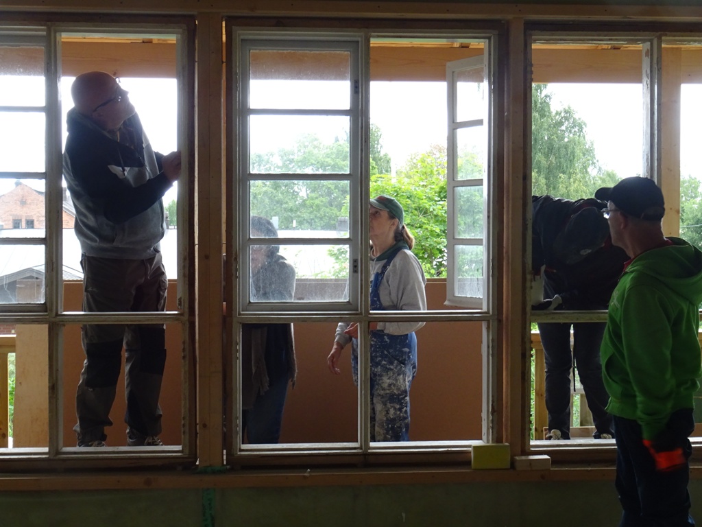 Vanhat ikkunat matkalla kuistin ikkuna-aukkoihin.